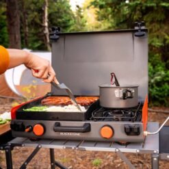 Pack your Blackstone 12″ x 14” Camping Griddle with you on your next adventure and enjoy delicious meals wherever you end up. Built for the outdoors with a protective hood. durable latches. and a ‘Stow and Go’ Rear Grease cup. this griddle is ready for the outdoors whenever you are. The griddle paired with an independently controlled side burner makes it easy to cook up your favorite griddle foods with the added versatility of being able to heat up sauces. soups. or boil water on the side burner. The push-button ignition makes starting and heating your griddle easy. and the leveling feet provide you with a more even cooking surface no matter the terrain. Enjoy your favorite foods wherever you are with the Adventure Ready 14” Griddle with Side Burner!