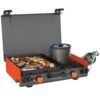 Pack your Blackstone 12″ x 14” Camping Griddle with you on your next adventure and enjoy delicious meals wherever you end up. Built for the outdoors with a protective hood. durable latches. and a ‘Stow and Go’ Rear Grease cup. this griddle is ready for the outdoors whenever you are. The griddle paired with an independently controlled side burner makes it easy to cook up your favorite griddle foods with the added versatility of being able to heat up sauces. soups. or boil water on the side burner. The push-button ignition makes starting and heating your griddle easy. and the leveling feet provide you with a more even cooking surface no matter the terrain. Enjoy your favorite foods wherever you are with the Adventure Ready 14” Griddle with Side Burner!