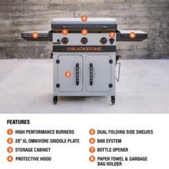 The Bronco 28” XL Griddle with Cabinet is your must-have outdoor cooking companion. Equipped with Omnivore Griddle Plate Technology. you’ll enjoy quicker preheat and recovery times. even heat distribution. and higher fuel efficiency. Dual cabinets and dual folding side shelves make prepping and serving your favorite meals effortless. Saddle up for great meals with the Bronco 28” XL Griddle with Cabinet –effortless. powerful. and built for any feast!