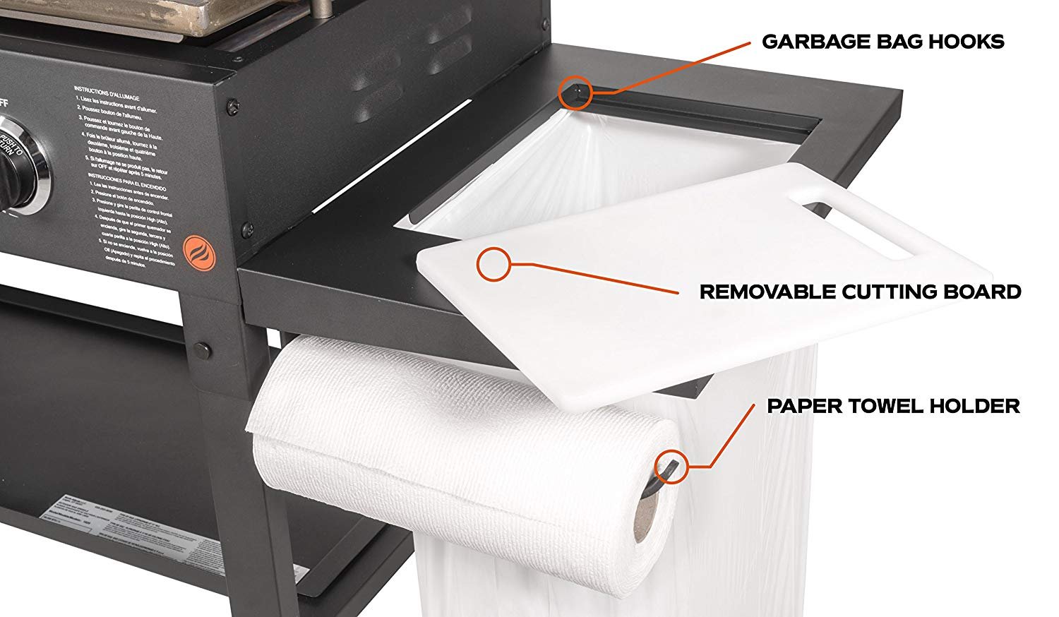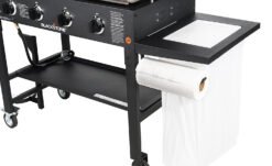 The Blackstone 36″ Griddle Cooking Station with Accessory Side Shelf gives you the control you need to be an outdoor cooking pro. Four independently-controlled heat zones offer 60.000 BTUs of heat to give you all the power you need to serve an entire crowd with restaurant-quality steaks. or up to 28 burgers or 72 hot dogs! Enjoy all the benefits of a standard 36″ griddle with the added convenience of a cutting board. garbage bag hanger. and paper towel holder. making prep and clean-up a cinch. Now fully equipped with the patented rear grease management system. Join the Griddle Nation and cook anything. anytime. anywhere with a Blackstone.